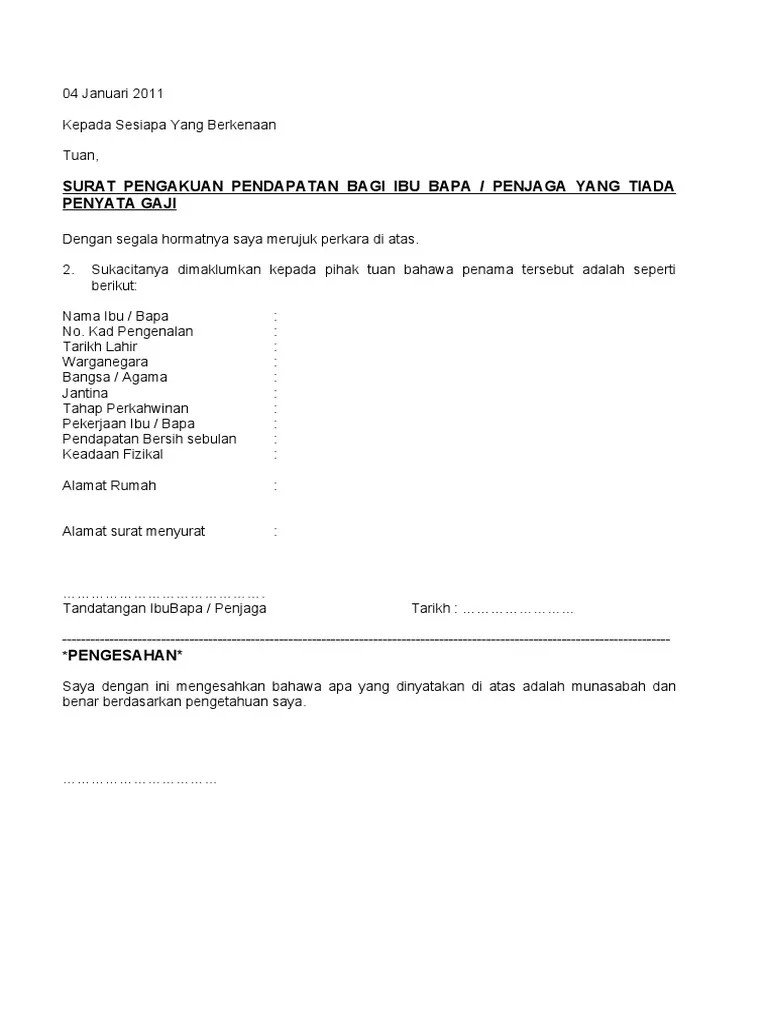 Lazimnya, individu yang bekerja sendiri tidak mempunyai penyata pendapatan atau slip gaji yang dikeluarkan oleh pihak majikan. Surat pengesahan ibu atau bapa yang tiada slip gaji untuk diberikann kepada pihak sekolah. Sekiranya slip gaji tidak ada, maka surat pengesahan pendapatan ini. Surat pengesahan ibu bapa tanpa penyata gaji. Contoh surat pengesahan pendapatan bagi yang tiada penyata gaji download kumpulan gambar. Surat akuan pengesahan pendapatan surat akuan tiada slip gaji/ tidak bekerja surat akuan sumpah penjagaan. Pengesahan hendaklah dilakukan oleh pegawai . Surat pengesahan ibu bapa tanpa penyata gaji tq lebel surat akuan pendapatan bagi ibu bapa penjaga yang tiada .
